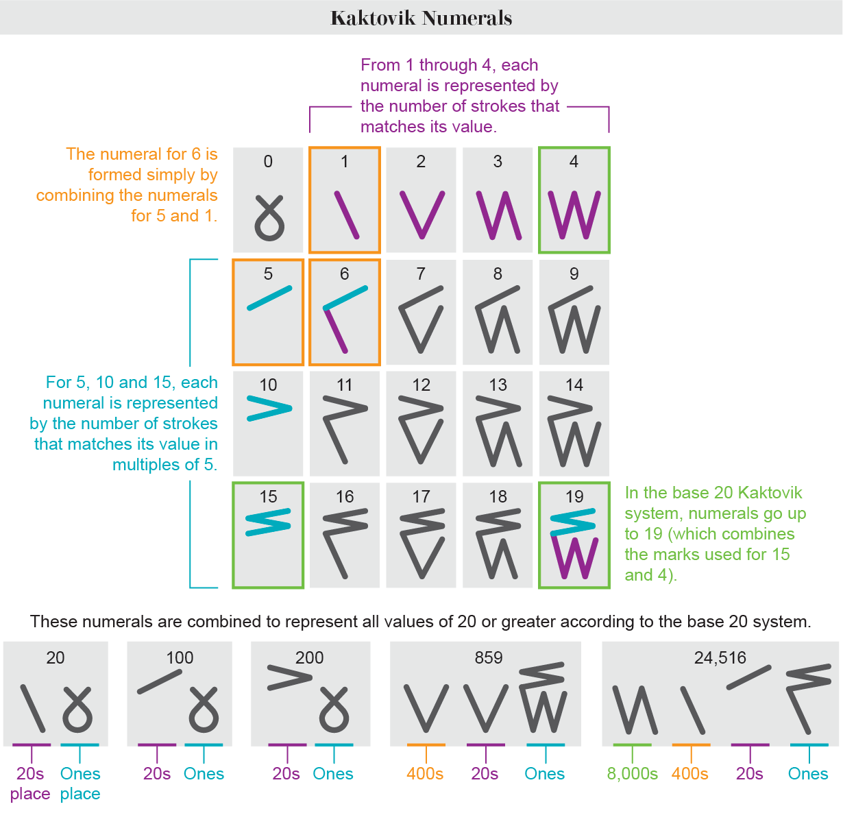 The numerals themselves are uniquely suited for quick, visual arithmetic using the traditional Inuit oral counting system, which is based on the human body. Quantities are first described in groups of five, 10, 15, and then 20. Unfortunately, the system was erased by the 1990s when American schools suppressed the native language and counting systems.
